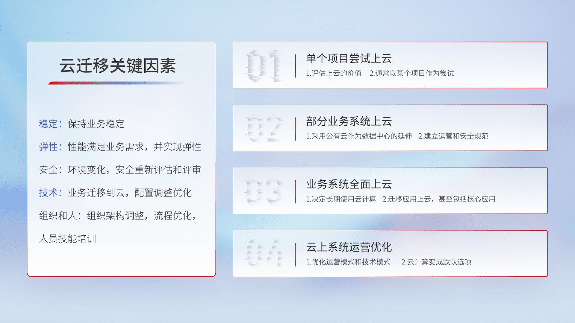 结合实际业务,,,,从规划设计、、云平台选型、、、、云原生改造、、、数据迁移、、、、集成交付,,迁移全过程为客户识别最佳上云路径,,,,做好风险识别管理,,,,设计网络架构、、、、身份权限、、、、安全审计合规、、、、操作审计、、日志审计、、、、监控告警策略、、多站点容灾设计等,,,对云上基础设施进行整体规划,,提升IT治理水平,,,,以满足弹性、、、、高可用、、高性能的需求。。。